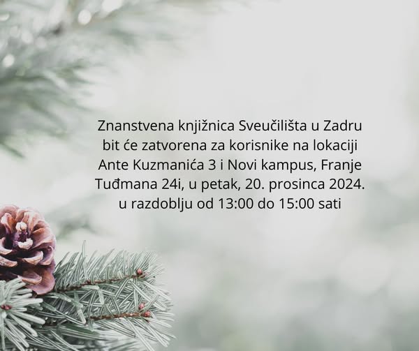 Znanstvena knjižnica Sveučilišta u Zadru bit će zatvorena za korisnike na lokaciji Ante Kuzmanića 3 i Novi kampus, Franje Tuđmana 24i, u petak, 20. prosinca 2024. u razdoblju od 13:00h do 15:00h