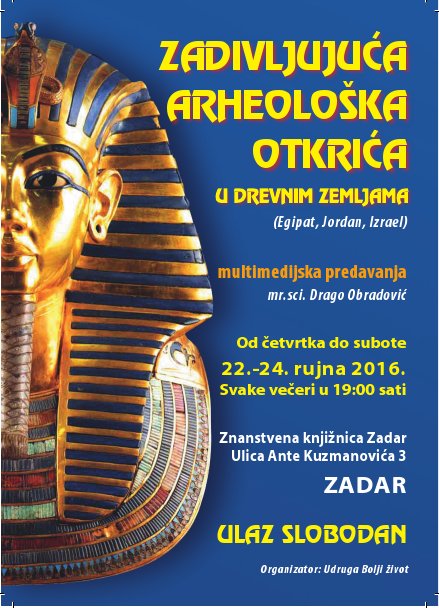 Od 22. do 24. rujna u Izložbenoj dvorani Znanstvene knjižnice održat će se serija predavanja "ZADIVLJUJUĆA ARHEOLOŠKA OTKRIĆA U DREVNIM ZEMLJAMA" koju organizira Udruga "Bolji život".