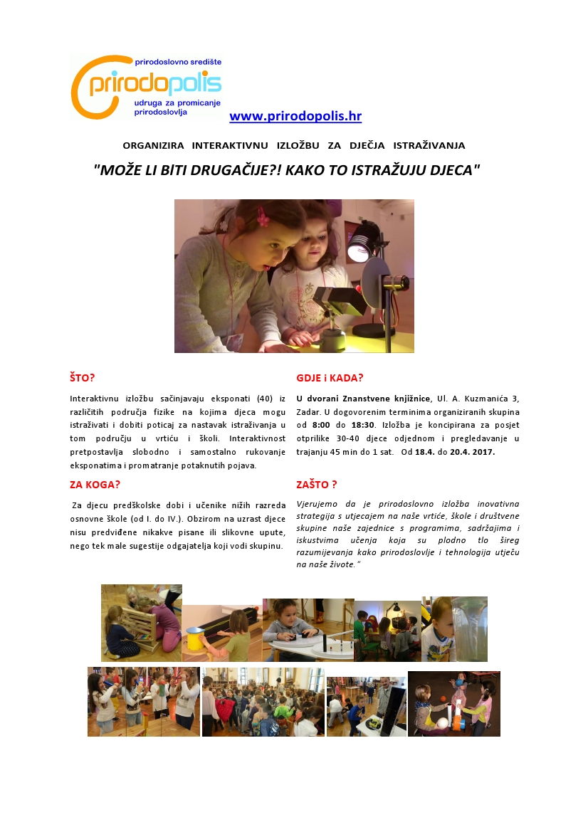 Od utorka, 18. travnja do četvrtka, 20. travnja u Izložbenoj dvorani Znanstvene knjižnice održat će se interaktivna izložba "MOŽE LI BlTI DRUGAČIJE?! KAKO TO ISTRAŽUJU DJECA" koju priređuje Udruga "Prirodopolis".