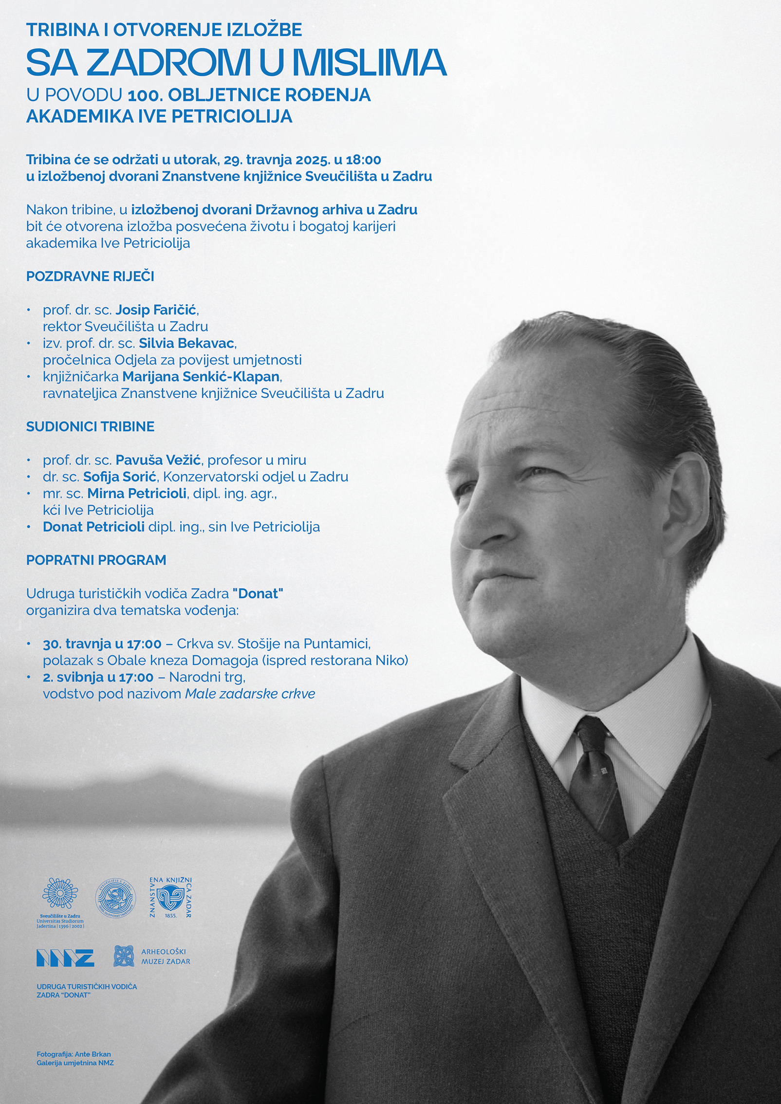 Povodom 100 obljetnice rođenja akademika Ive Petriciolija, Sveučilište u Zadru organizira izložbu i tribinu pod naslovom Sa Zadrom u mislima.