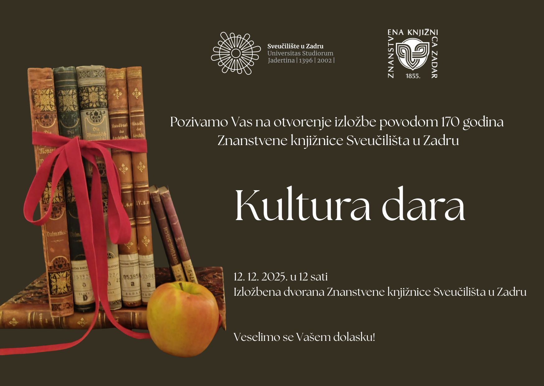 Znanstvena knjižnica Sveučilišta u Zadru s ponosom Vas poziva na otvorenje izložbe Kultura dara, posvećene bogatoj tradiciji darivanja knjižnične građe pojedinaca, obitelji, ustanova, lokalne samouprave, zaklada i projekata koje su oblikovale našu knjižnicu tijekom njezinih 170 godina postojanja.