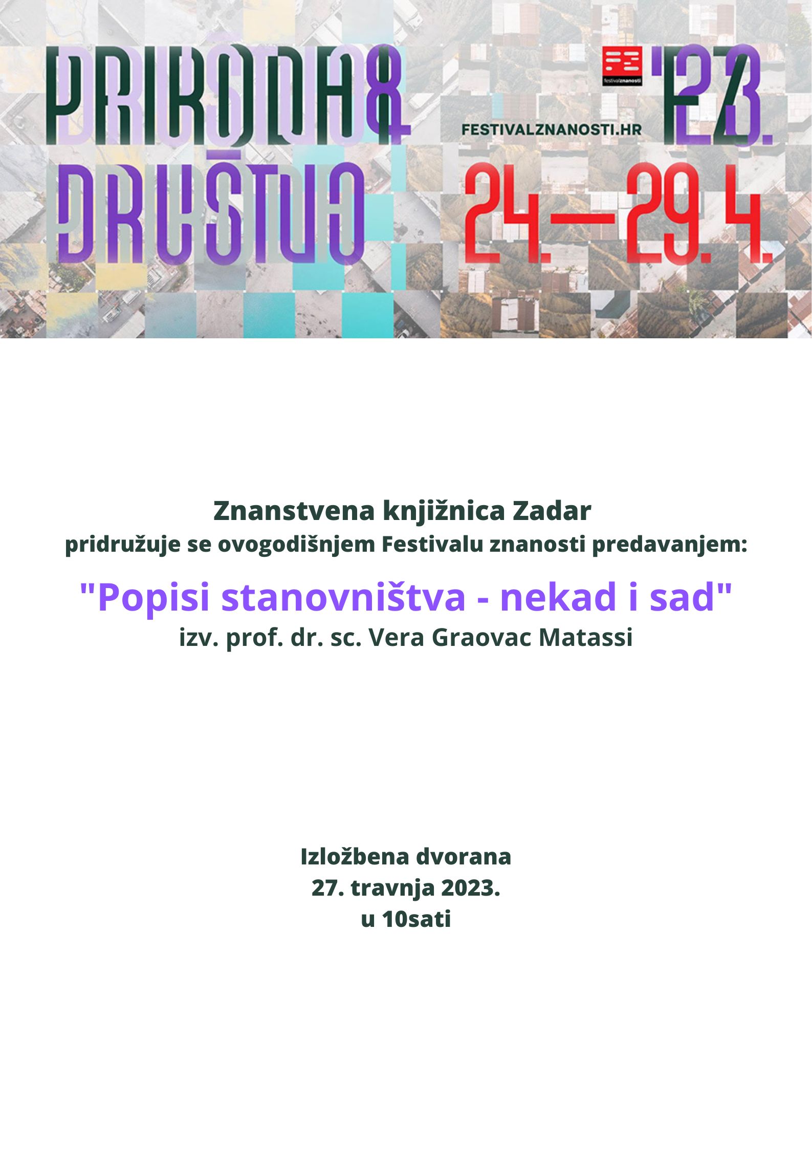 Znanstvena knjižnica Zadar pridružila se ovogodišnjem Festivalu znanosti zanimljivim predavanjem izv. prof. dr. sc. Vere Graovac Matassi pod naslovom Popisi stanovništva - nekad i sad koje će održati 27. travnja 2023. u 10 sati u Izložbenoj dvorani Znanstvene knjižnice Zadar.