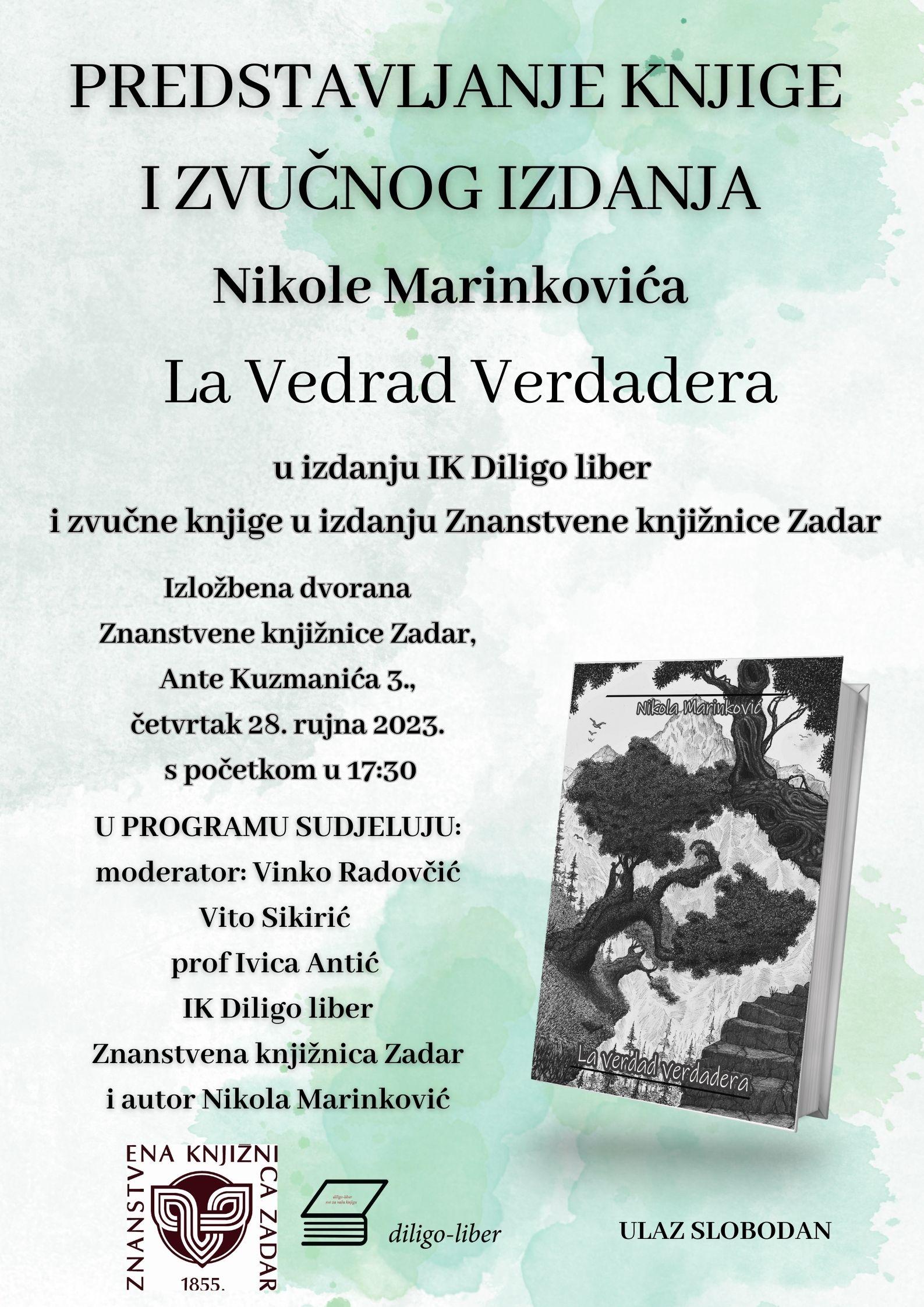Znanstvena knjižnica Zadar i Diligo liber organizatori su predstavljanja knjige i zvučnog izdanja romana La verdad verdadera autora Nikole Marinkovića. Predstavljanje knjige i zvučne knjige bit će u četvrtak 28.9.2023. u 17:30 sati u Izložbenoj dvorani Znanstvene knjižnice Zadar. Moderator događanja je Vinko Radovčić. Uz samog autora, u programu sudjeluju Ivica Antić, Vito Sikirić, Marijana Senkić-Klapan v.d. ravnatelja Znanstvene knjižnice Zadar, Brajen Dragičević djelatnik Čitaonice prilagođene osobama s invaliditetom Znanstvene knjižnice Zadar, urednica knjige Kristina Koren Kudelić iz izdavačke kuće Diligo libera.