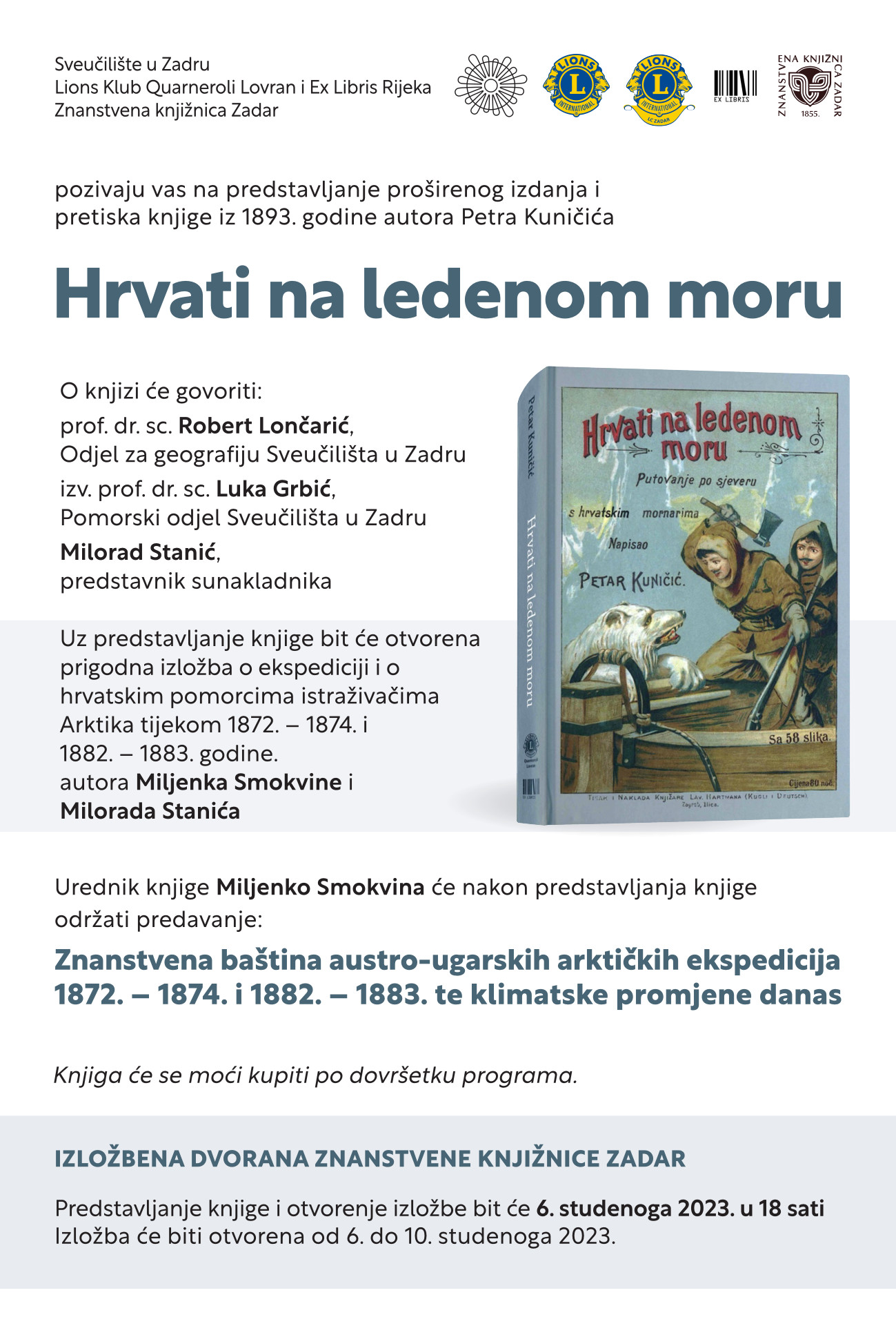 Sveučilište u Zadru u suradnji s Lions klubom Quarnerol Lovran, Ex Librisom i Znanstvenom knjižnicom poziva vas na predstavljanje proširenog izdanja knjige Petra Kuničića iz 1893. godine "Hrvati na ledenom moru" te na otvorenje izložbe o ekspediciji i o hrvatskim pomorcima, istraživačima Arktika, autora Milorada Stanića i Miljenka Smokvine koji je nakon godina istraživanja detalja te polarne ekspedicije pripremio pretisak i nadopunu Kuničićeve knjige. Predstavljanje knjige i izložba bit će priređeni 6. studenoga 2023. godine s početkom u 18 sati u izložbenoj dvorani Znanstvene knjižnice Zadar.