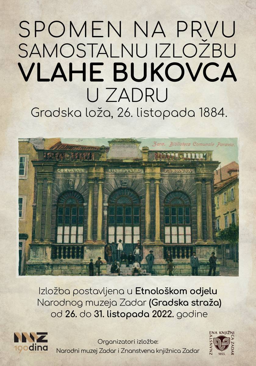 Narodni muzej Zadar i Znanstvena knjižnica Zadar organiziraju izložbu povodom obilježavanje 138 godina od prve samostalne izložbe Vlahe Bukovca, održane 26. listopada 1884. godine u prvom sjedištu Znanstvene knjižnice Zadar (Biblioteca Comunale Paravia) u Gradskoj loži.