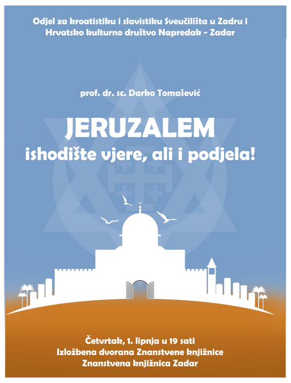 U četvrtak, 1. lipnja u 19,00 sati u Izložbenoj dvorani Znanstvene knjižnice održat će se predavanje "JERUZALEM - ISHODIŠTE VJERE, ALI I PODJELA". Predavač je prof. dr. sc. Darko Tomašević.
