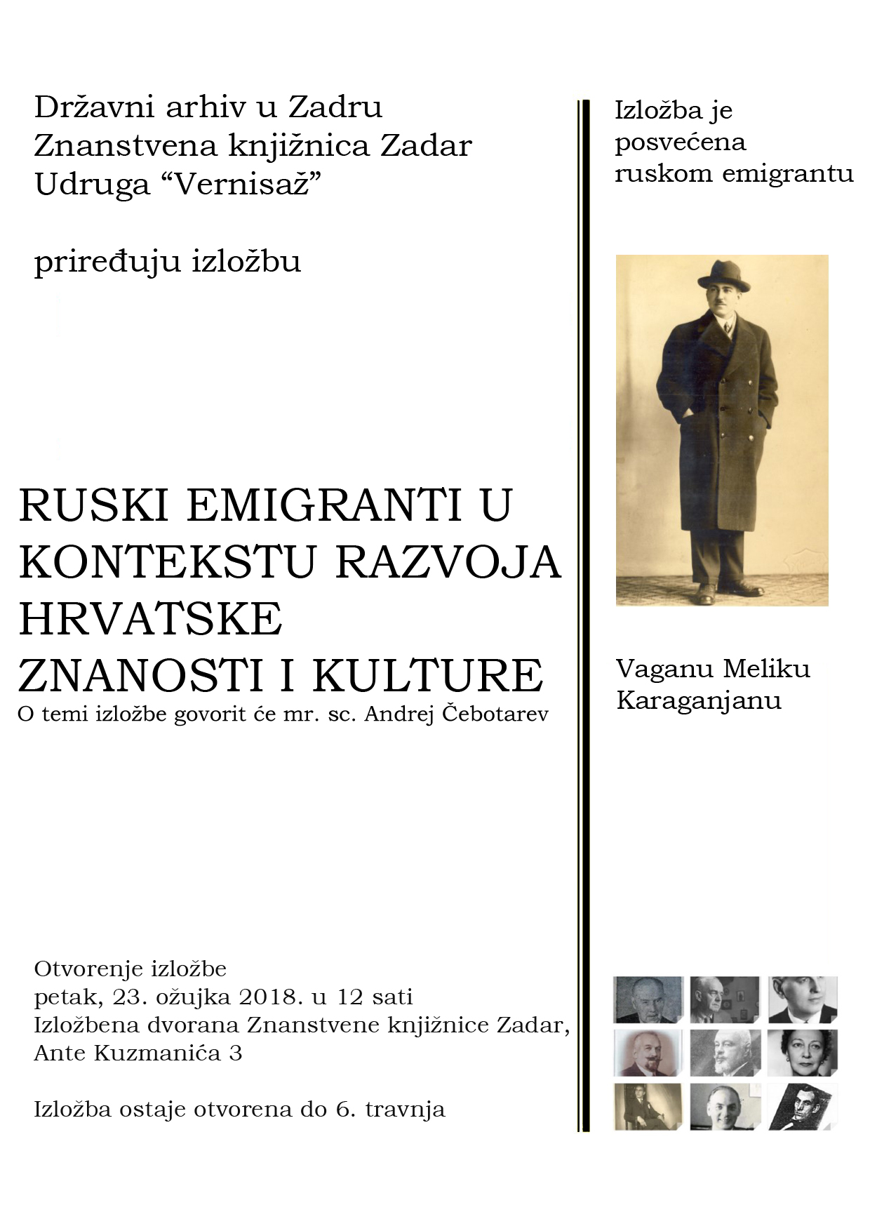 U petak, 23. ožujka u 12,00 sati u Izložbenoj dvorani Znanstvene knjižnice otvorit će se izložba "RUSKI EMIGRANTI U KONTEKSTU RAZVOJA HRVATSKE ZNANOSTI I KULTURE", koju priređuju Državni arhiv u Zadru, Znanstvena knjižnica Zadar i Udruga "Vernisaž".