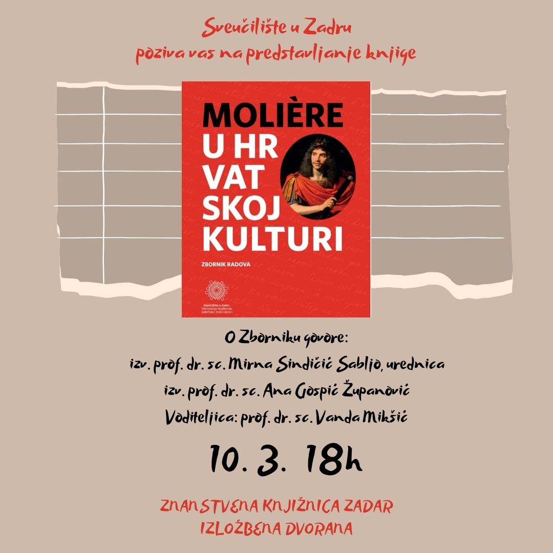 U sklopu programa obilježavanja Mjeseca frankofonije, Odjel za francuske i frankofonske studije Sveučilišta u Zadru poziva vas na predstavljanje knjige "Molière u hrvatskoj kulturi" (Sveučilište u Zadru, 2024.). O zborniku će govoriti izv. prof. dr. sc. Mirna Sindičić Sabljo i izv. prof. dr. sc. Ana Gospić Županović, a program će voditi prof. dr. sc. Vanda Mikšić. Predstavljanje će se održati u izložbenoj dvorani Znanstvene knjižnice Sveučilišta u Zadru, u ponedjeljak 10. ožujka 2025. godine s početkom u 18h. Veselimo se vašem dolasku!