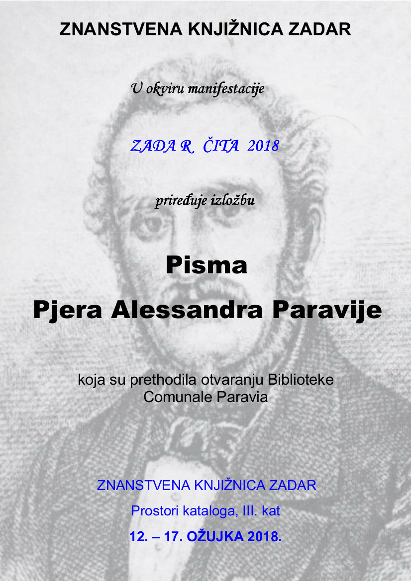 U ponedjeljak, 12. ožujka u 12,30 sati u prostorima kataloga Znanstvene knjižnice (III. kat) otvorit će se izložba "PISMA PJERA ALESSANDRA PARAVIJE KOJA SU PRETHODILA OTVARANJU BIBLIOTEKE COMUNALE PARAVIA".