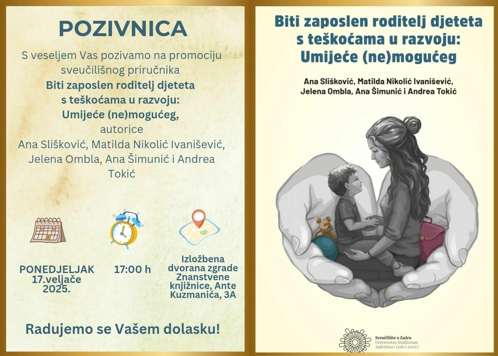 U ponedjeljak, 17. veljače s početkom u 17.00 sati u Izložbenoj dvorani Znanstvene knjižnice Sveučilišta u Zadru u organizaciji Odjela za psihologiju Sveučilišta u Zadru održat će se promocija sveučilišnog priručnika "Biti zaposlen roditelj djeteta s teškoćama u razvoju: Umijeće (ne)mogućeg", autorice su: Ana Slišković, Matilda Nikolić Ivanišević, Jelena Ombla, Ana Šimunić i Andrea Tokić.