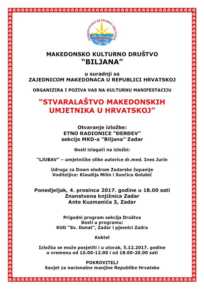 U ponedjeljak, 4. prosinca u 18,00 sati u Izložbenoj dvorani Znanstvene knjižnice održat će se kulturna manifestacija "STVARALAŠTVO MAKEDONSKIH UMJETNIKA U HRVATSKOJ", koju priređuje Makedonsko kulturno društvo "Biljana" u suradnji sa Zajednicom Makedonaca u Republici Hrvatskoj, a pod pokroviteljstvom Savjeta za nacionalne manjine Republike Hrvatske..