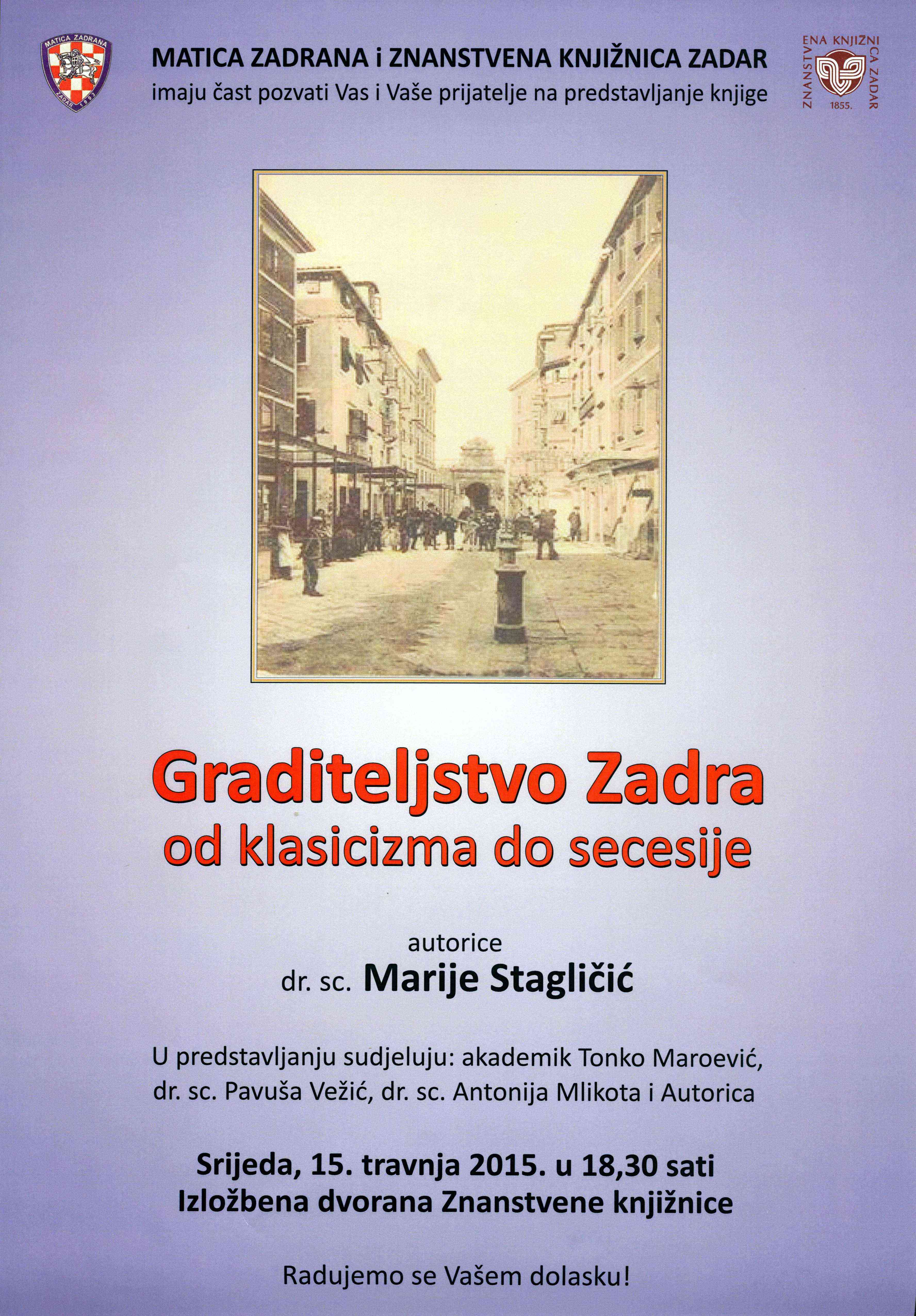 U srijedu, 15. travnja u 18,30 sati u Izložbenoj dvorani Znanstvene knjižnice održat će se predstavljanje knjige "GRADITELJSTVO ZADRA OD KLASICIZMA DO SECESIJE" Marije Stagličić.