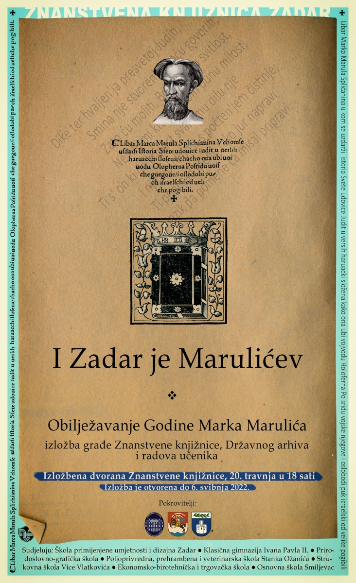 U srijedu, 20. travnja u 18,00 sati Izložba najznačajnijih Marulićevih tiskanih i rukopisnih djela u fondu Znanstvene knjižnice i Državnog arhiva te učeničkih radova na temu Judite, a u sklopu manifestacije "I ZADAR JE MARULIĆEV"