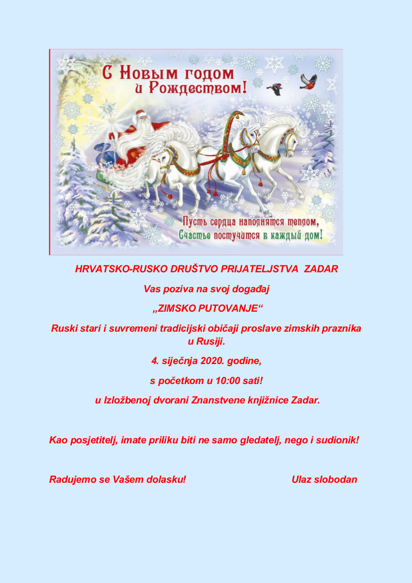 U subotu, 4. siječnja u 10,00 sati u Izložbenoj dvorani Znanstvene knjižnice održat će radionica "ZIMSKO PUTOVANJE", na kojoj će biti predstavljeni stari i suvremeni tradicijski običaji proslave zimskih praznika u Rusiji.