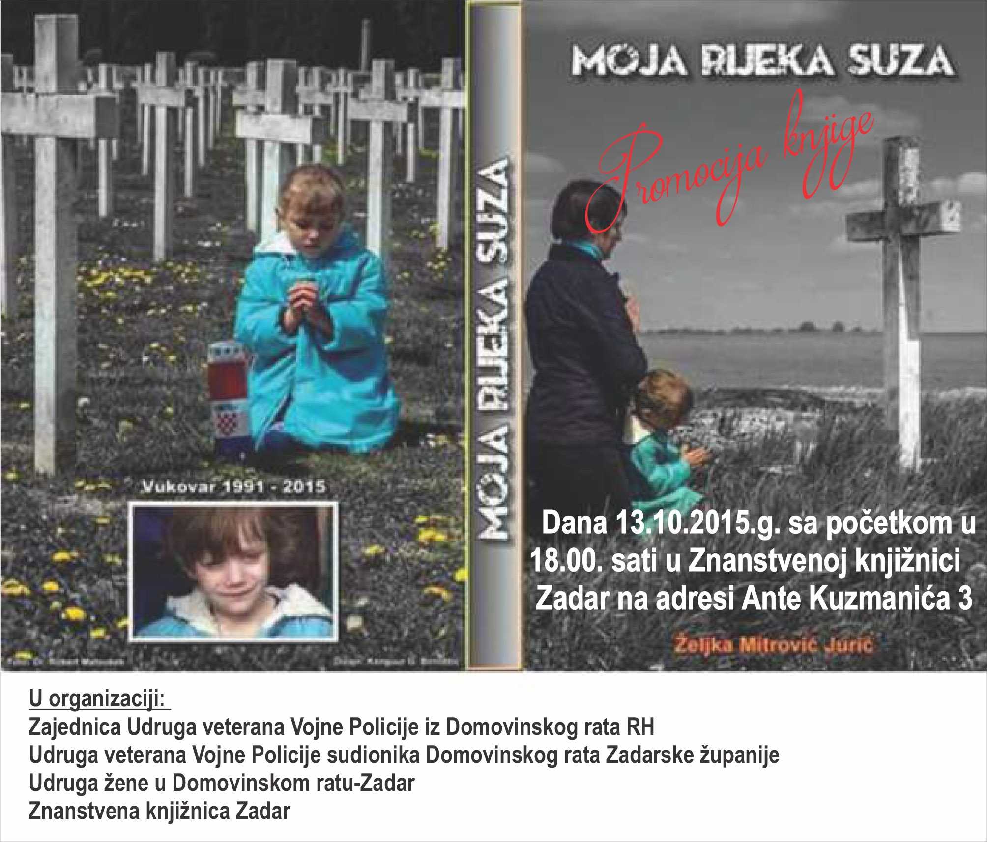 U utorak, 13. listopada u 18,00 sati u Izložbenoj dvorani Znanstvene knjižnice održat će se predstavljanje knjige „MOJA RIJEKA SUZA“ autorice Željke Mitrović Jurić. Predstavljanje organiziraju Zajednica udruga veterana vojne policije iz Domovinskog rata RH, Udruga veterana vojne policije sudionika Domovinskog rata Zadarske županije, Udruga Žene u Domovinskom ratu - Zadar i Znanstvena knjižnica Zadar.