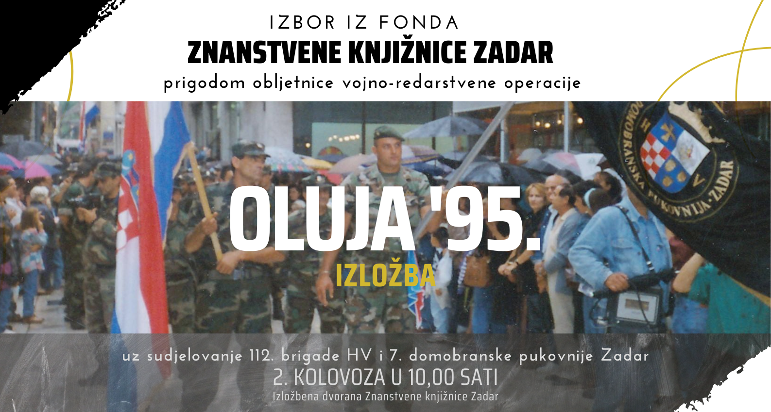 U utorak, 2. kolovoza u 10,00 sati u Izložbenoj dvorani Znanstvene knjižnice otvorit će se izložba "OLUJA '95." Prigodom obljetnice vojno-redarstvene operacije bit će izložen izbor iz fonda Knjižnice, uz sudjelovanje 112. brigade HV-a i 7. domobranske pukovnije Zadar.