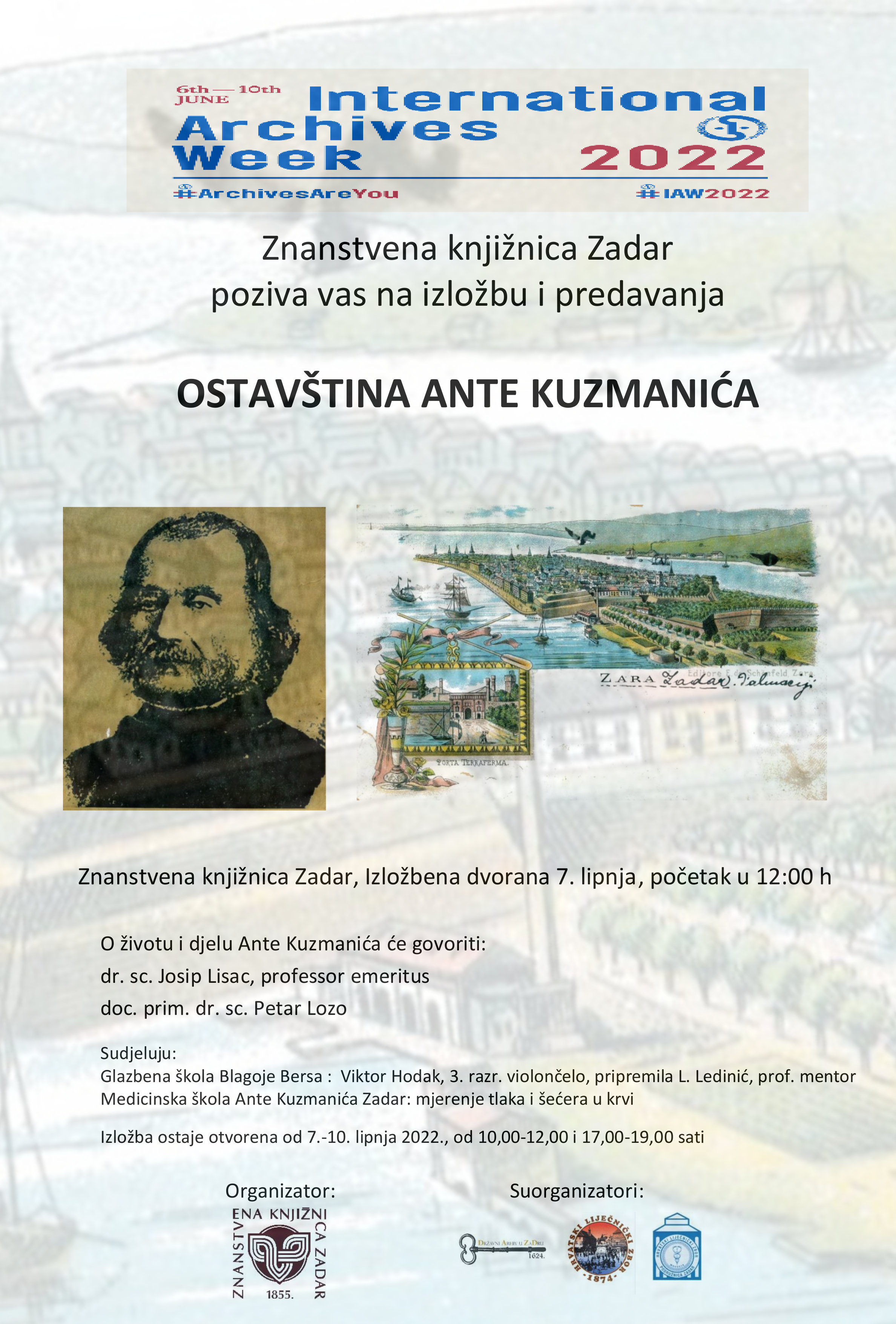 U utorak, 7. lipnja u 12,00 sati u Izložbenoj dvorani Znanstvene knjižnice otvorit će se izložba "OSTAVŠTINA ANTE KUZMANIĆA". O životu i djelu Ante Kuzmanića će govoriti dr. sc. Josip Lisac, professor emeritus i doc. prim. dr. sc. Petar Lozo.