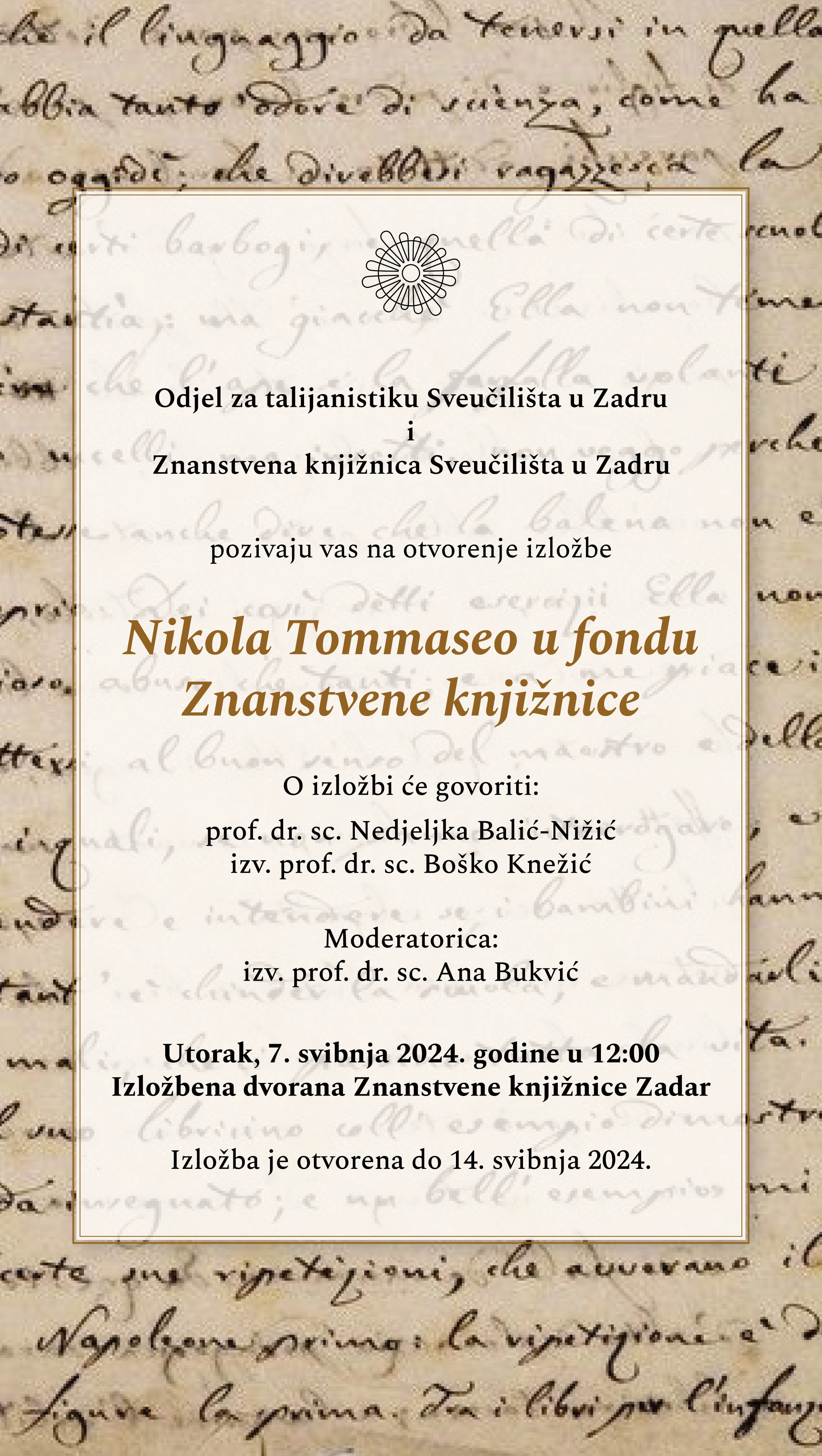 Odjel za talijanistiku Sveučilišta u Zadru u suradnji sa Znanstvenom knjižnicom Sveučilišta u Zadru organizira izložbu Nikola Tommaseo u fondu Znanstvene knjižnice povodom obilježavanja 150. godišnjice smrti slavnog Šibenčanina. Otvorenje izložbe predviđeno je za utorak, 7. svibnja 2024. godine u 12:00 sati u Izložbenoj dvorani Znanstvene knjižnice Sveučilišta u Zadru. O izložbi će govoriti prof. dr. sc. Nedjeljka Balić-Nižić, izv. prof. dr. sc. Boško Knežić, a događaj će moderirati izv. prof. dr. sc. Ana Bukvić s Odjela za talijanistiku. Izložba će biti otvorena za posjetitelje do 14. svibnja 2024.