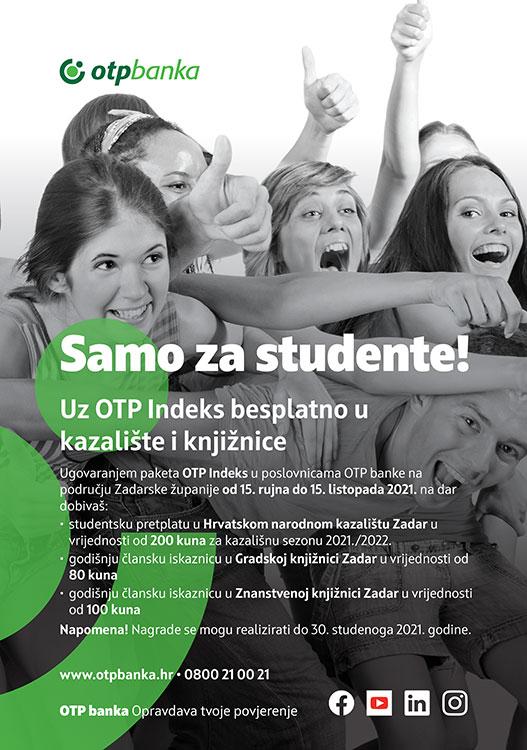 Studenti koji u razdoblju od 15. rujna do 15. listopada 2021. u poslovnicama OTP banke na području Zadarske županije ugovore paket OTP Indeks na dar dobivaju studentsku pretplatu Hrvatskog narodnog kazališta Zadar te članske iskaznice Gradske knjižnice Zadar i Znanstvene knjižnice Zadar.